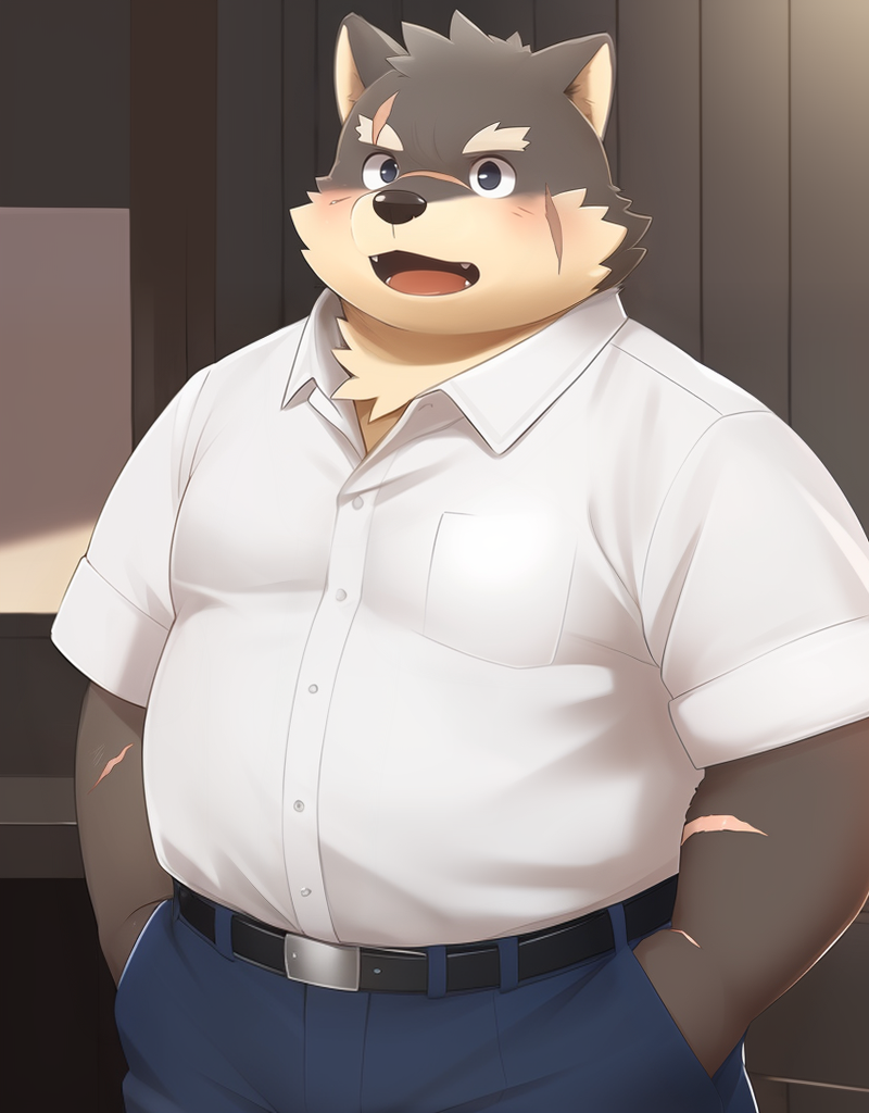 相关词:棕色毛发、白色毛发、双色毛发、短发、胸毛、男性阴毛、黑色眼睛、浓眉、狗尾、狼尾、狗男孩、狼男孩、狗耳朵、狼耳朵、动物耳朵、动物鼻子、吻部、獠牙、面部疤痕、脸颊疤痕、胸部疤痕、手臂疤痕、鼻子疤痕、有领衬衫、卷起袖子、蓝色裤子、皮带、鞋子、棕色鞋履、盔甲、小手甲、日本盔甲、武器、刀、 katana、部分解开、敞开衣物、敞开夹克、正式、黑色夹克、西装外套、长袖、黑色背心、领结、交叉领带、泳裤、泳装、爪印、头戴护目镜