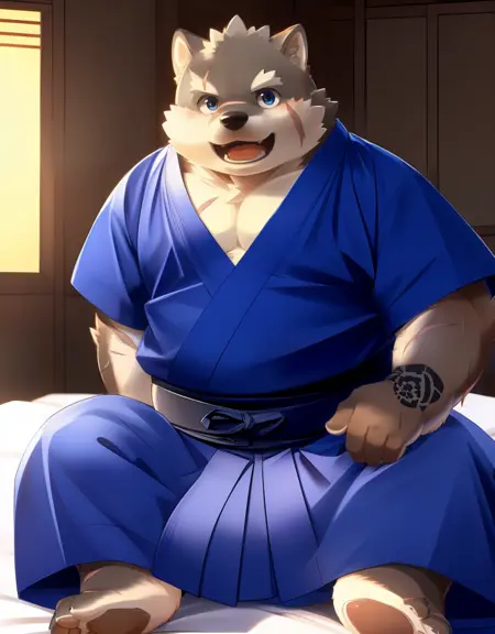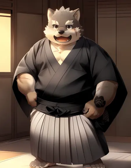 関連ワード:茶色の毛、白い毛、ツートンの毛、短い髪、胸毛、男性の恥毛、黒い目、濃い眉、犬の尾、オオカミの尾、犬男、オオカミ男、犬の耳、オオカミの耳、動物の耳、動物の鼻、吻、牙、複数の牙、顔の傷、頬の傷、胸の傷、腕の傷、鼻の傷、シャツの襟、袖をまくった、青いズボン、ベルト、靴、茶色の履物、鎧、小手、日本の鎧、武器、剣、 katana、一部ボタンが外れた、開いた服、開いたジャケット、フォーマル、黒ジャケット、スーツジャケット、長袖、黒ベスト、蝶ネクタイ、クロスタイ、水着、足跡、頭にゴーグル