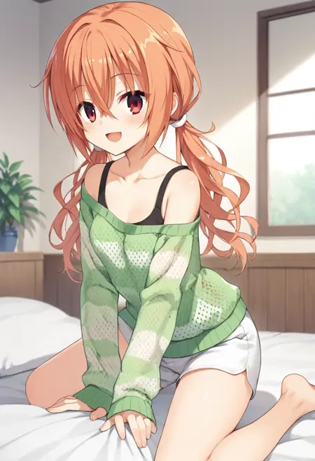 meguru-casual, inaba meguru, 빨간 눈, 주황색 머리, 긴 머리, 낮은 트윈테일, 녹색 스웨터, 손목보다 긴 소매, 어깨 노출, 흰색 반바지, 짧은 반바지, 목걸이, 보석, 파란 샌들