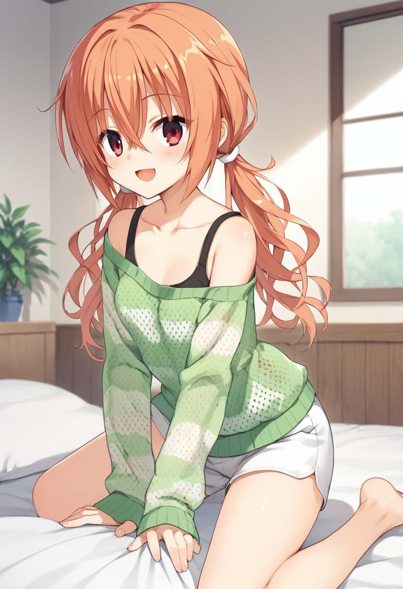 meguru-casual, inaba meguru,red eyes,orange hair,long hair,low twintails, green sweater,sleeves past wrists,off shoulder, white shorts,short shorts,necklace,jewelry,blue sandals