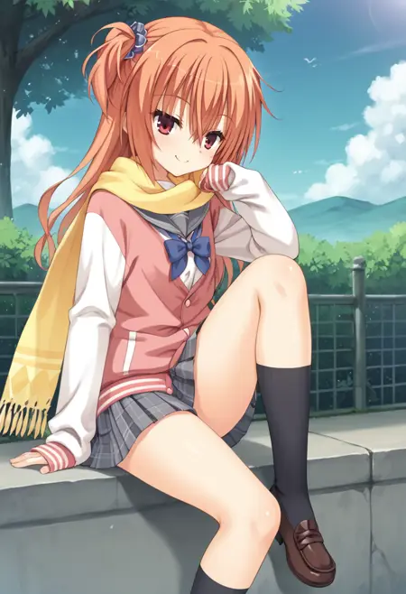 meguru-default, inaba meguru,red eyes,orange hair,long hair,one side up,school uniform,sleeves past wrists,pleated skirt,yellow scarf,black socks,loafers