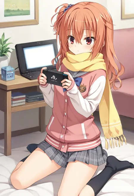 meguru-default, inaba meguru, 빨간 눈, 주황색 머리, 긴 머리, 한쪽만 올린 머리, 학교 uniform, 손목보다 긴 소매, 접힌 치마, 노란 스카프, 검은 양말, 로퍼