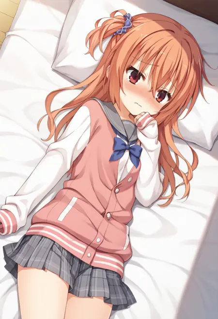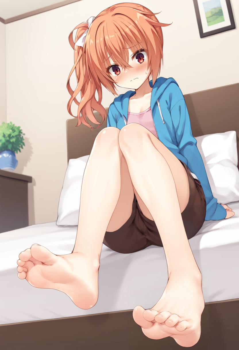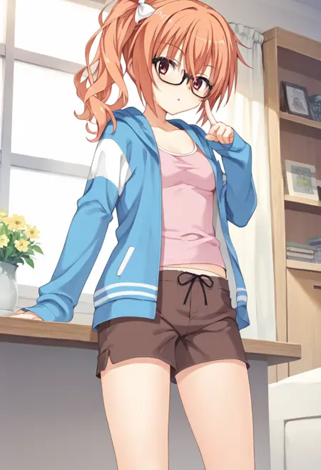 meguru-roomwear, inaba meguru,red eyes,orange hair,side ponytail,white hair ribbon,blue hoodie,open hoodie, pink shirt,brown shorts,short shorts