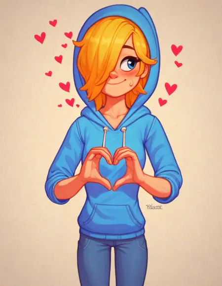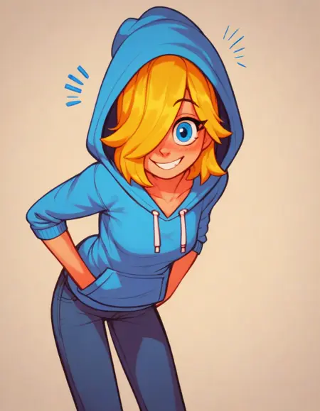 blonde hair, hood up, hair over one eye, missing tooth, blue hoodie, blue pants, denim