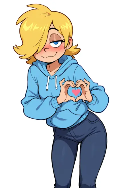 Pony: 金发,帽子拉起,头发遮住一只眼睛,缺牙,蓝色连帽衫,蓝色裤子,牛仔布