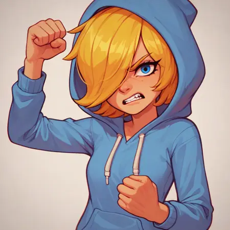 Pony: ブロンドの髪、フードをかぶる、片方の目に髪を垂らす、歯が抜けている、青いフーディ、青いズボン、デニム