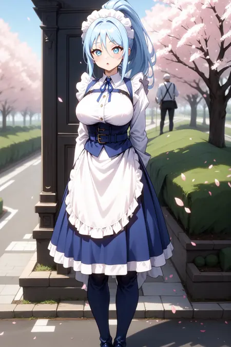 옷차림: 메이드 헤어악세서리, 분리형 칼라, 파란 리본, 긴 소매, 가슴 스트랩, 파란 코르셋, 높은 허리, 흰색 앞치마, 프릴이 달린 앞치마, 파란 치마, 프릴이 달린 치마, 파란 부츠