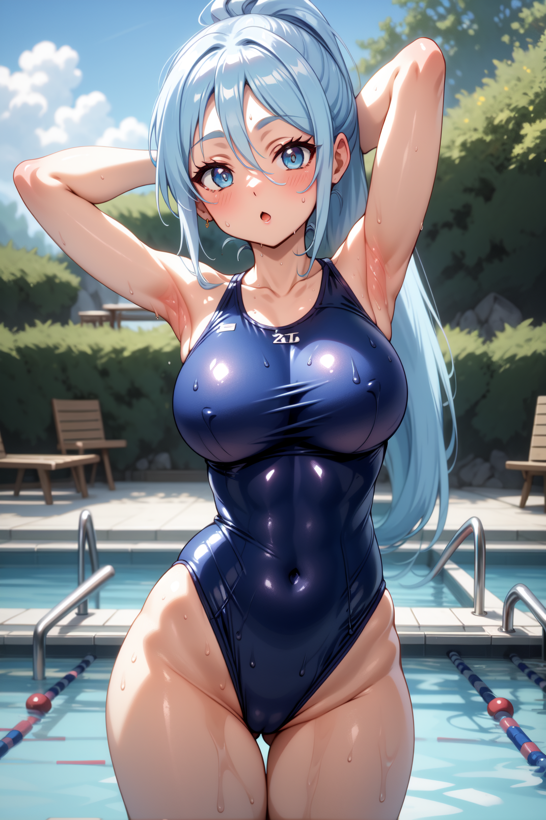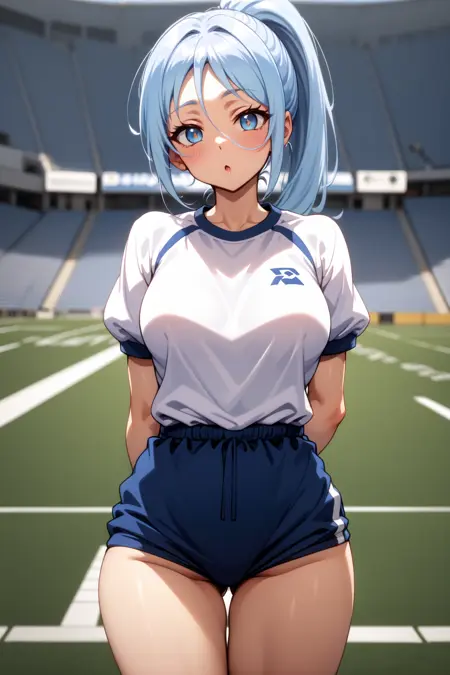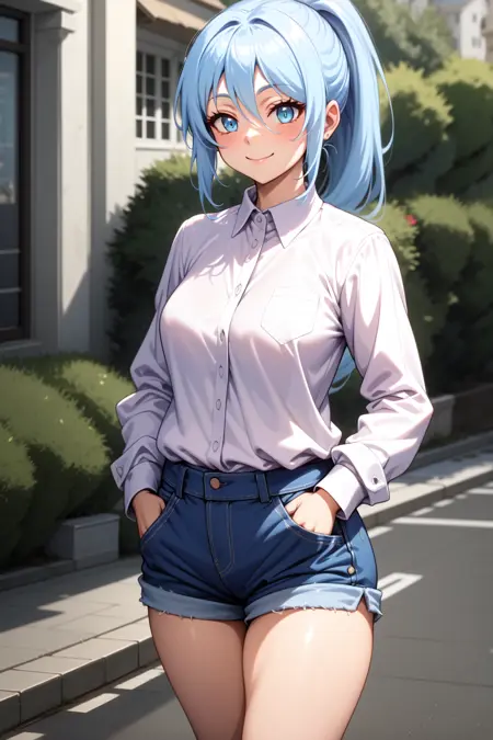 외모: 실파, 파란 눈, 연한 파랑 머리카락, 매우 긴 머리카락, 포니테일