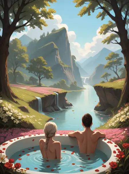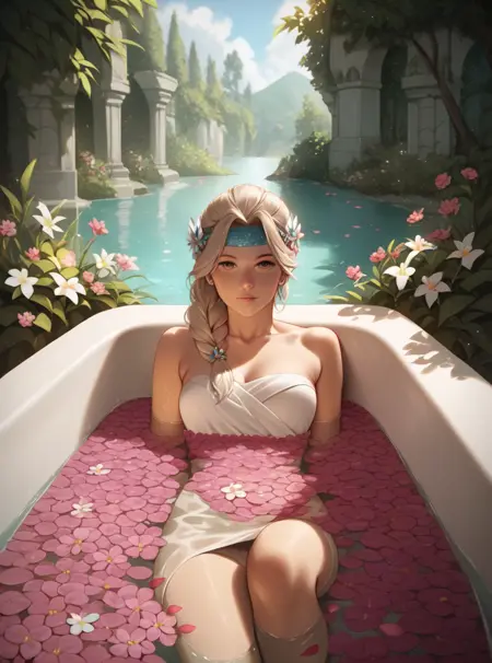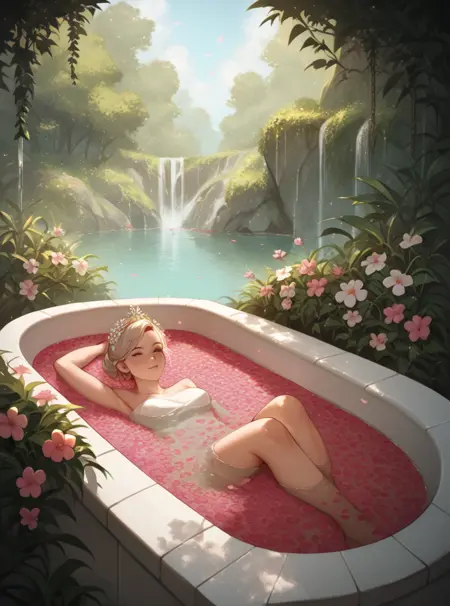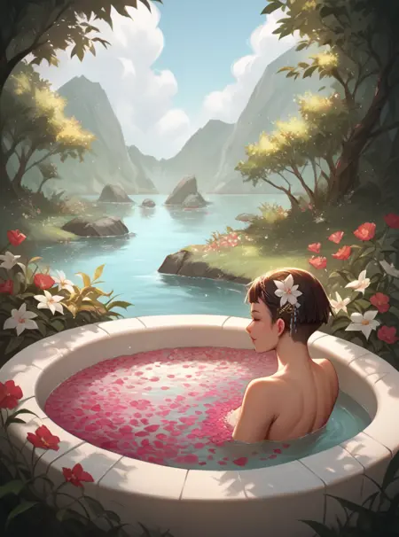 Extra: water, bathtub, bathing, from behind, from above, scenery, closed eyes, nude, swimsuit, smile, etc,