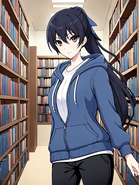 흰색 셔츠, 파란색 스웨트셔츠, 검은 바지,
