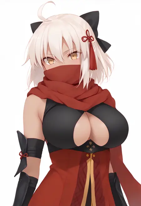 Outfit 1: ["okialter, yellow eyes, white hair, short hair, hair ornament, dark-skinned female, ahoge, bow, tassel, black bow, hair bow, red scarf, clothing cutout, black thighighs, arm guard, red, detached sleeves, cleavage, sideboob"]
