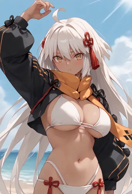 Outfit 2: ["okitaswim, yellow eyes, white hair, longhair, ahoge, dark-skinned female, tassel, white bikini, orange scarf, cropped jacket, shrug (clothing), black jacket, long sleeves"]