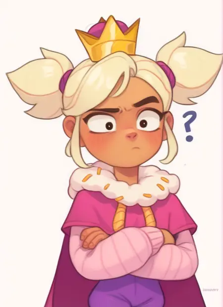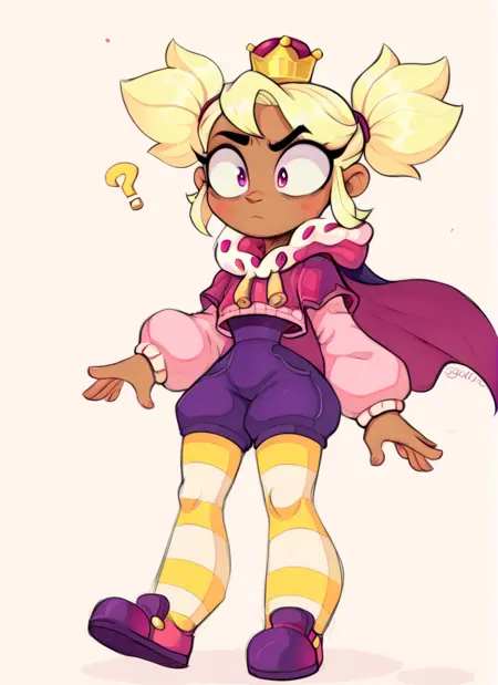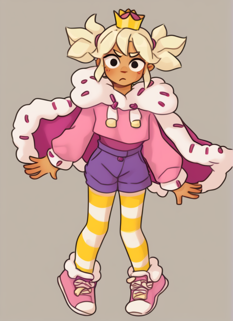 crown , full body, sbodysuit, purple shorts ,pink sweater, cape, yellow striped thighhighs,