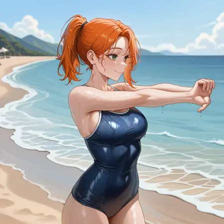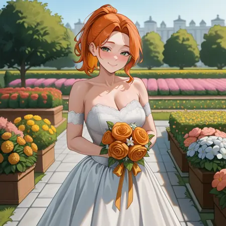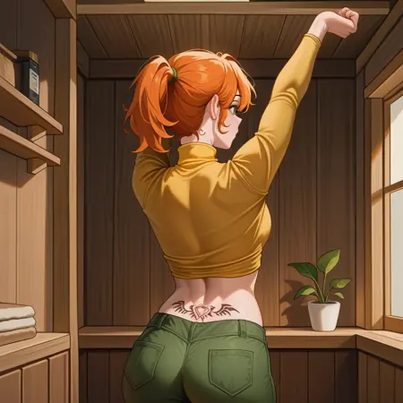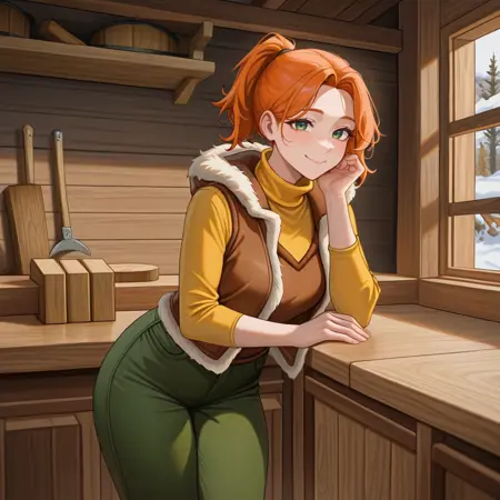Green eyes, orange hair, ponytail, yellow turtleneck, green pants, brown vest, fur trim