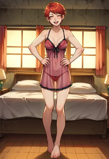 《辐射:新维加斯》中的红露西。提示词为“RedLucyFNV”,她的游戏默认服装包括“棕色风衣”等。