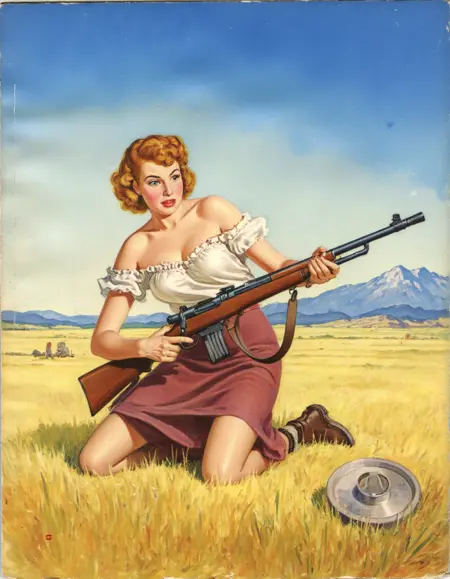 빨간 드레스를 입고 총을 들고 있는 여성을 루돌프 벨라스키 스타일로 그린 일러스트