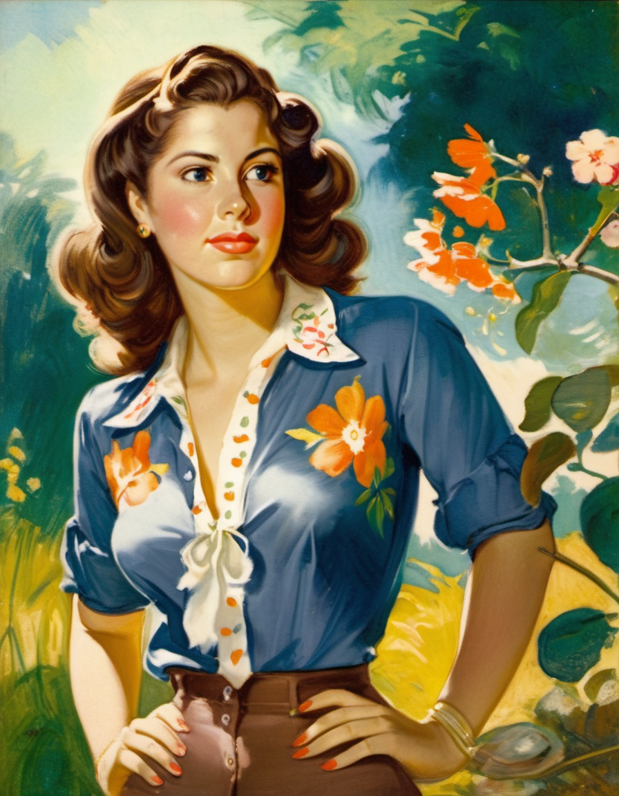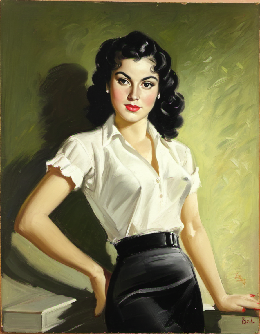 白いシャツと黒いスカートを着た女性のイラストをルドルフ・ベラルスキーのスタイルで