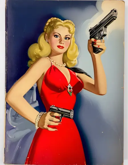 빨간 드레스를 입고 총을 들고 있는 여성을 루돌프 벨라스키 스타일로 그린 일러스트