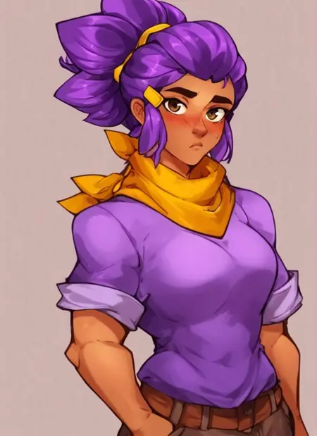 bsshelly ,purple hair, dark-skinned female, ponytail, hairclip,