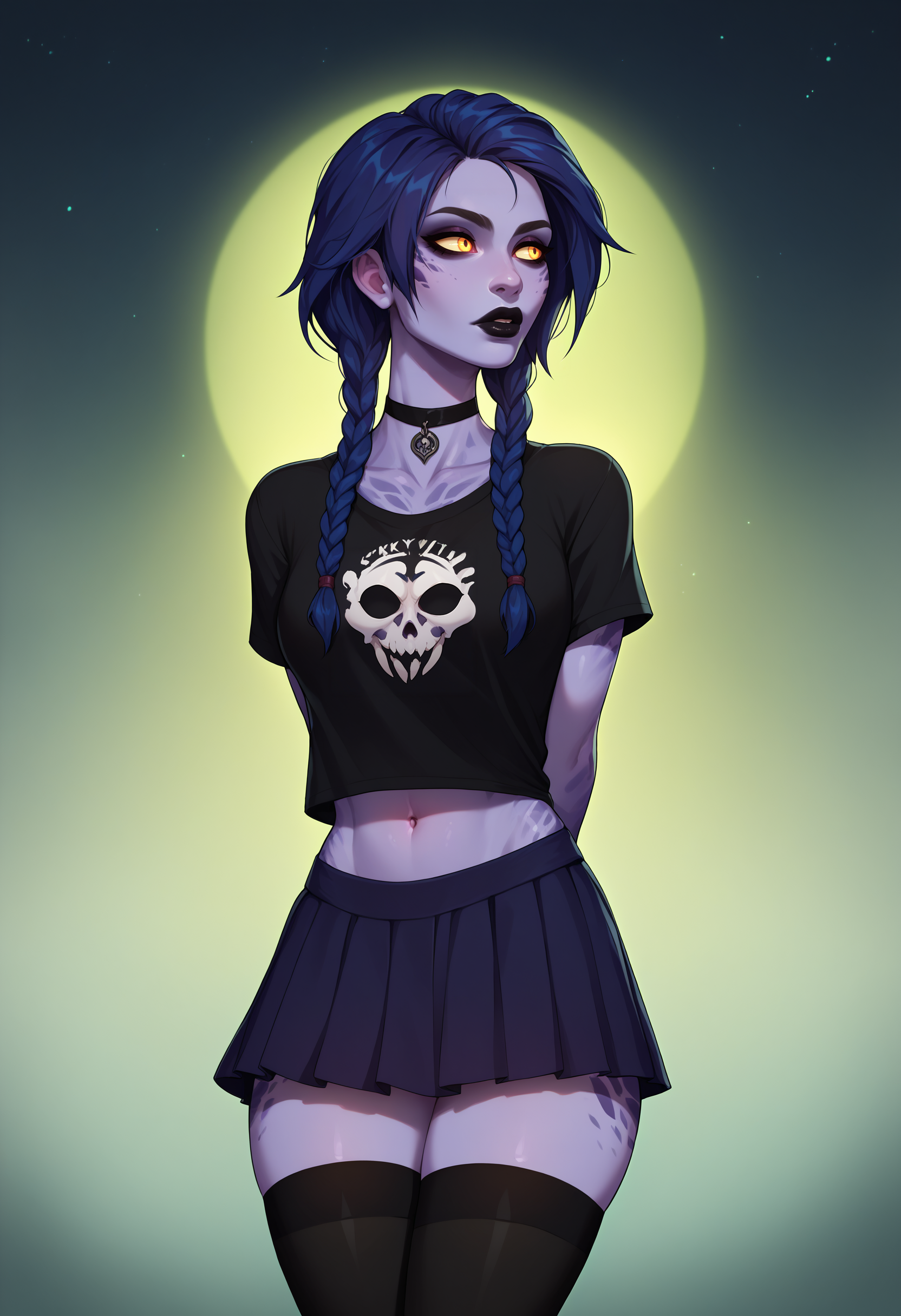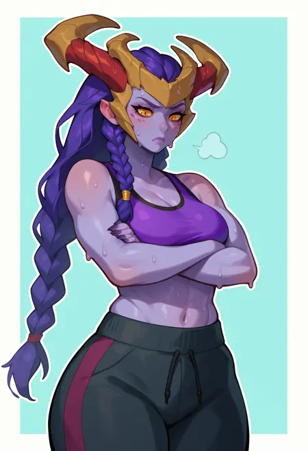 キャラクタータグ:紫の肌、ヘルメット、角、編み髪、モンスターガール