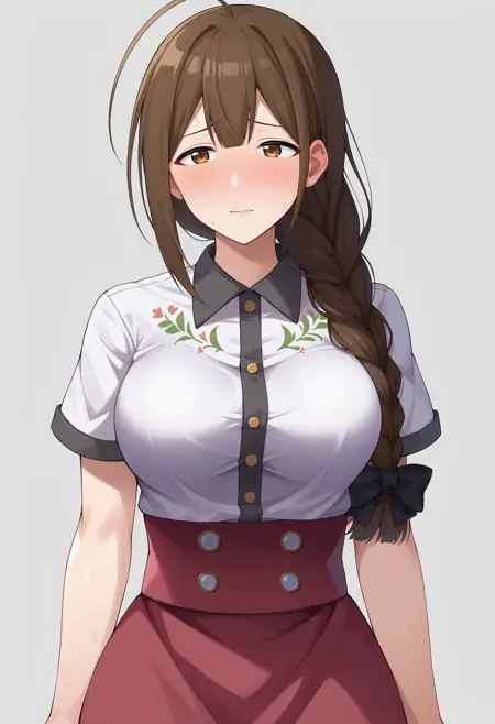 kuwayama chiyuki, large breasts, long hair, single braid, brown hair, ahoge, brown eyes