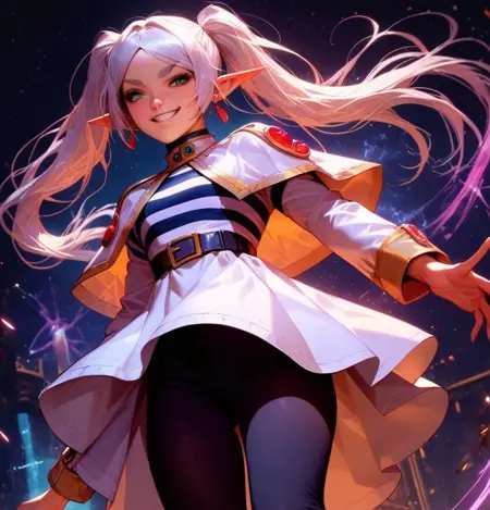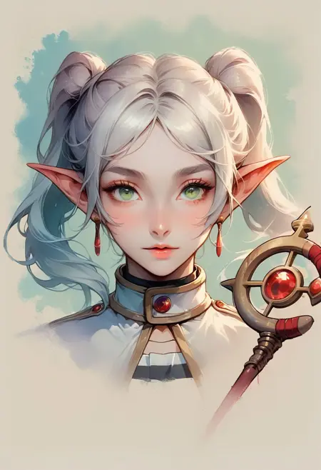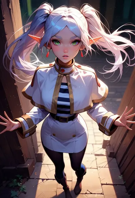 プロンプトアクティベーター:1girl, frieren, \(Frieren Beyond Journey's End\)/,(ultra HD quality details), pointy ears, twintails, green eyes, elf, long hair, white hair, parted bangs, pale skin, thick eyebrows,