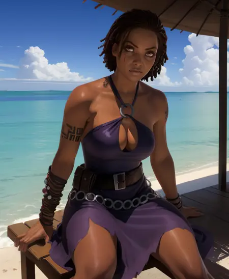 紫色连衣裙,O型环,露出胸部,裸露肩膀,腰带或环形腰带,手链,