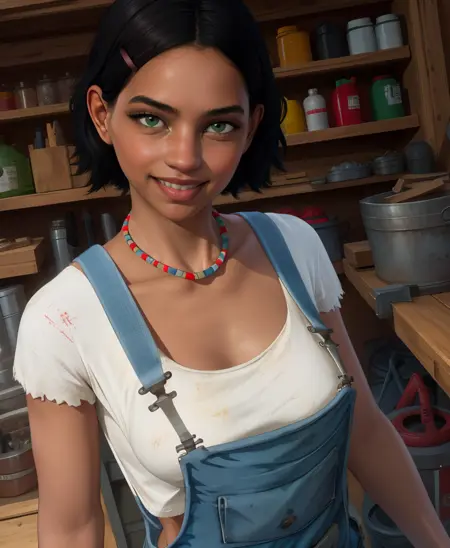 jindi, green eyes, black hair, hair clip, --- short hair, or medium hair,