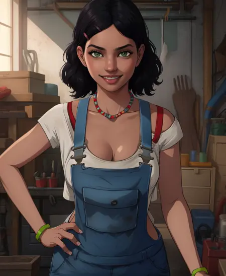 white shirt,necklace,overalls, belt, bracelet, boots,