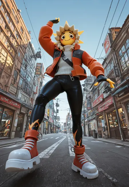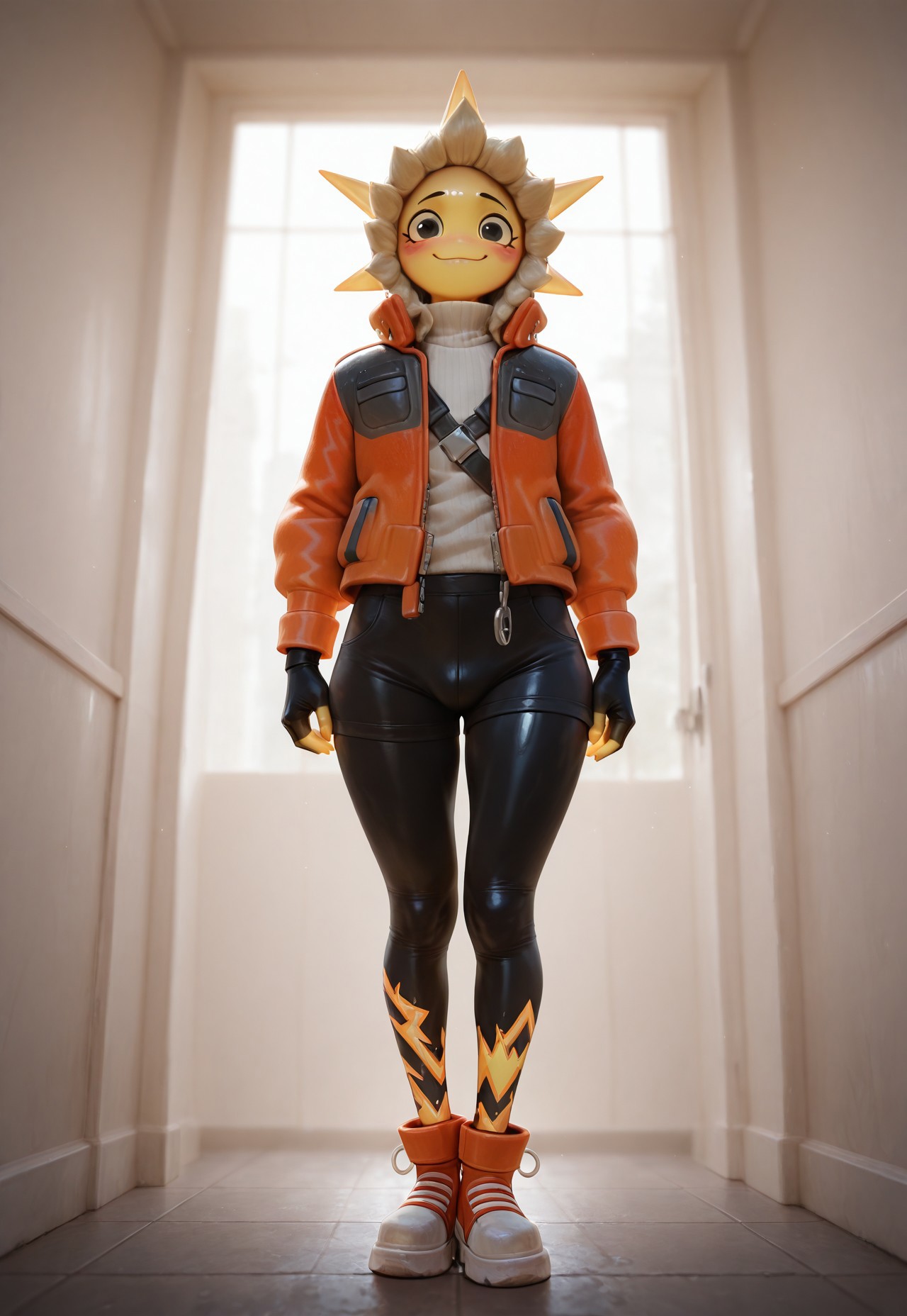 TAGS: sunspotfortnite, solo, full body, 1boy, yellow skin, colored skin, hood, black eyes, smile, blush, jacket, fingerless gloves, shoes