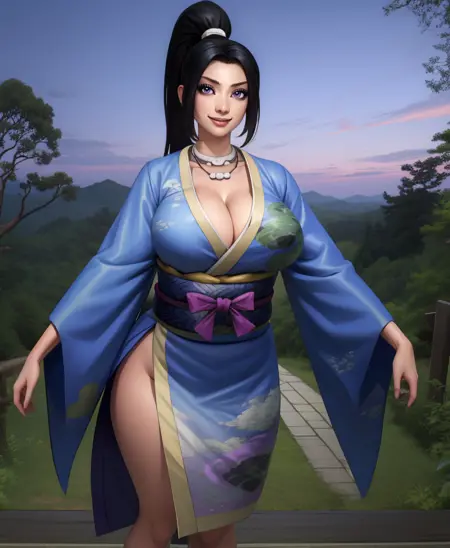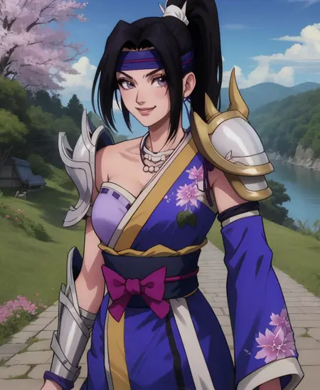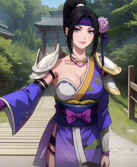 (青または紫)日本の服、着物、ローブ、胸元の露出、肩の露出、ネックレス、肩甲骨のアーマー、取り外し可能な袖、手甲