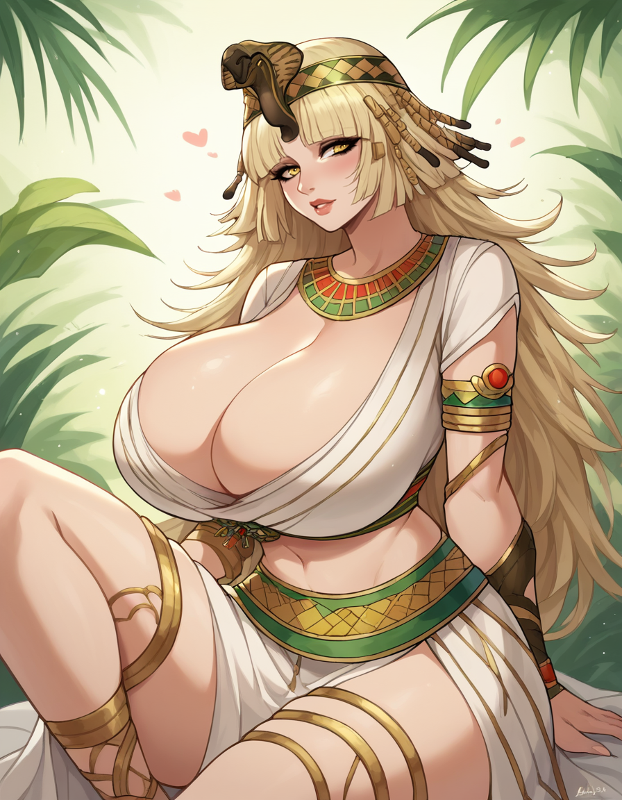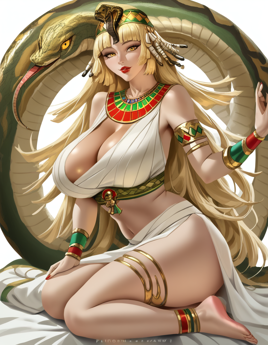 "cleosmt, long hair, uraeus, yellow sclera, yellow eyes, blunt bangs, blonde hair, colored sclera"