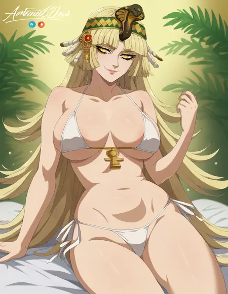 "cleosmt, long hair, uraeus, yellow sclera, yellow eyes, blunt bangs, blonde hair, egyptian clothes, armlet, jewelry, usekh collar, center opening, white ribbed crop top, thighlet,pelvic curtain,midriff,colored sclera"