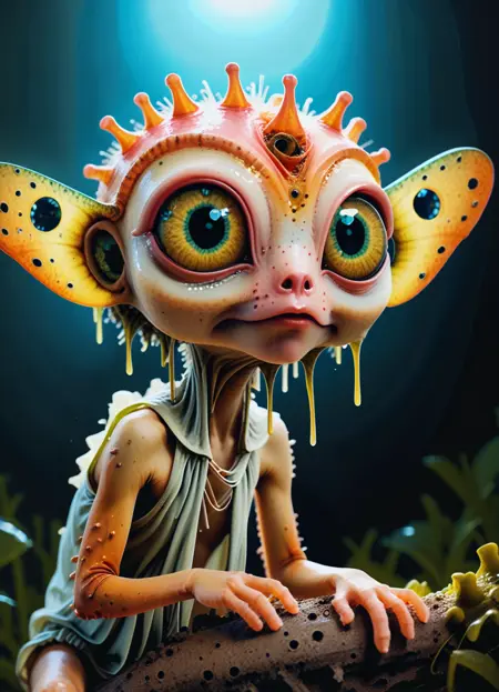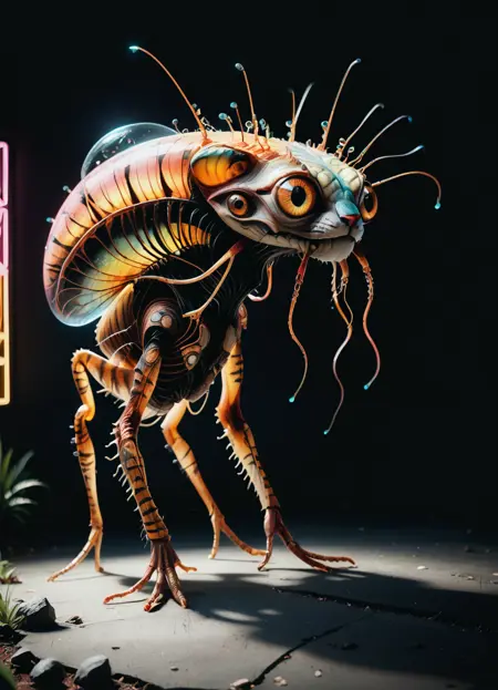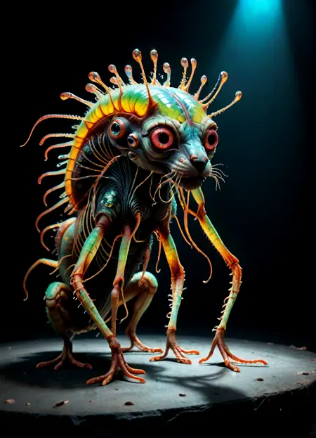 正向提示:score_9, score_8_up, score_7_up, source_photo, (photography, realistic:1.4), subsurface scattering, Photorealistic, Hyperrealistic, analog style, realistic, film photography, soft lighting, heavy shadow, (alien-like creature:1.2) ANIMAL NAME HERE-ANIMAL NAME HERE, (no humans:1.2)