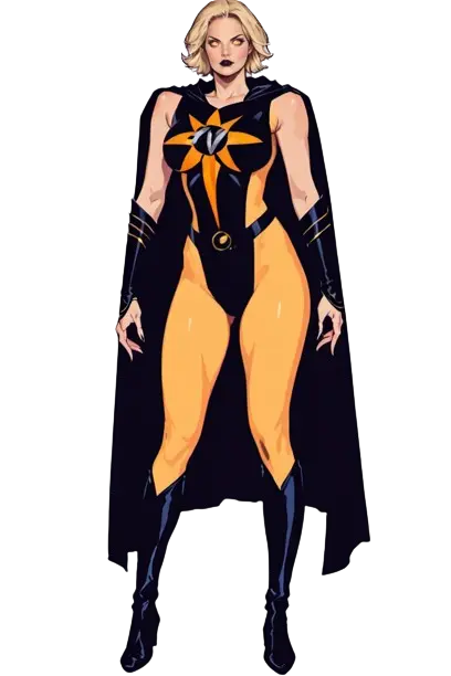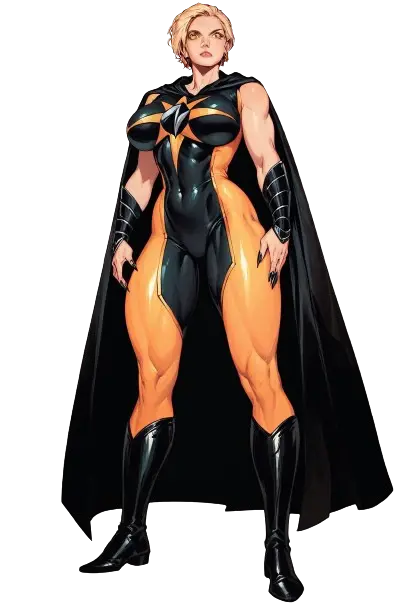 nuclearwoman, superhero, sharp nails, skin tight, bracer, sleeveless bodysuit, black belt, black cape, black boots,