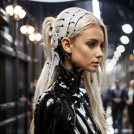 cyberpunk, 1girl, solo, long_hair, blonde_hair, closed_eyes, upper_body, ponytail, blurry, lips, bodysuit, makeup, science_fiction, realistic, android, cable, cyborg, cyberpunk