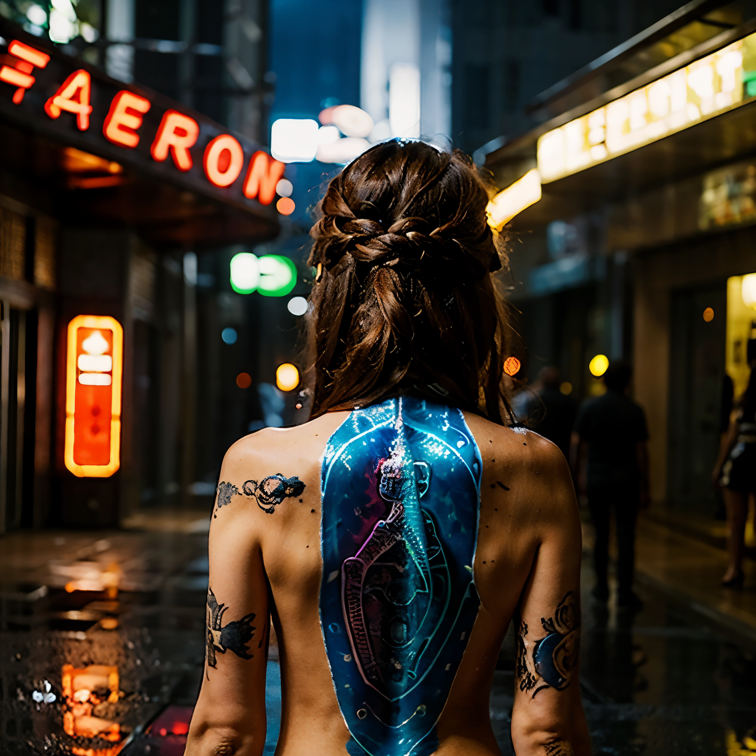 cyberpunk, 1girl, solo, long_hair, ass, nude, from_behind, tattoo, back, facing_away, colorful, back_tattoo