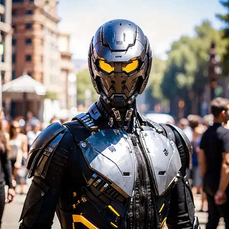 cyberpunk, solo, looking_at_viewer, 1boy, yellow_eyes, upper_body, male_focus, blurry, blurry_background, glowing, robot, mecha, glowing_eyes, science_fiction, straight-on, power_armor, humanoid_robot