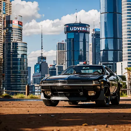 cyberpunk, 1boy, outdoors, ground_vehicle, building, motor_vehicle, science_fiction, city, retro_artstyle, car, cityscape, cyberpunk