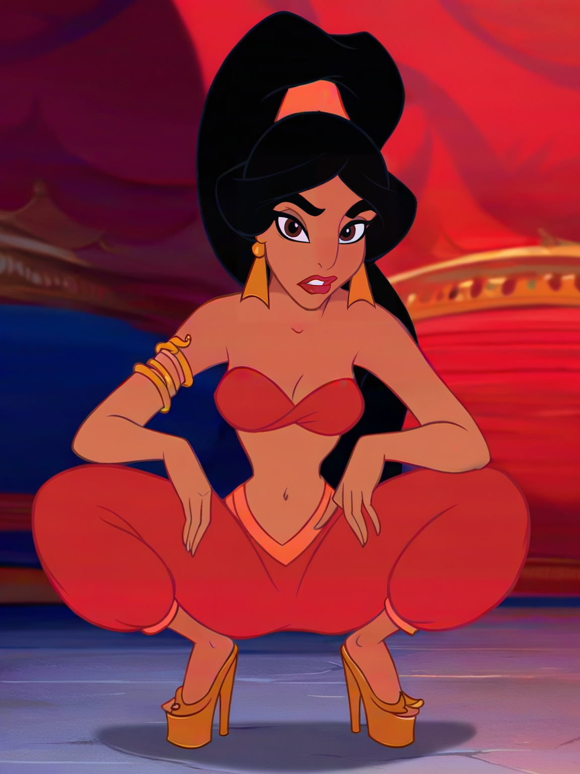 奴隶服装: "ja_n, 1girl, 阿拉伯女性, 棕色皮肤, 黑发, 红唇, 棕色眼睛, 三角形金色耳环, 带发带的高马尾, 金色蛇形臂环, 红色比基尼上衣, 红色沙尔瓦长裤 + 金色冠冕"