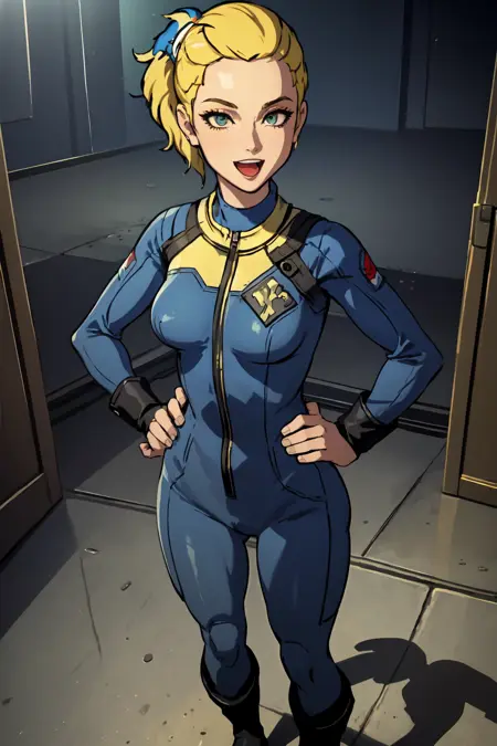 《辐射:新维加斯》中的莎拉·温特劳布。提示词为“SarahFNV”。她的服装使用“bodysuit,uniform”效果最佳,为了最还原游戏中的发型,请使用“short ponytail”。