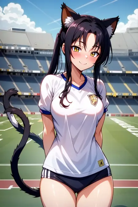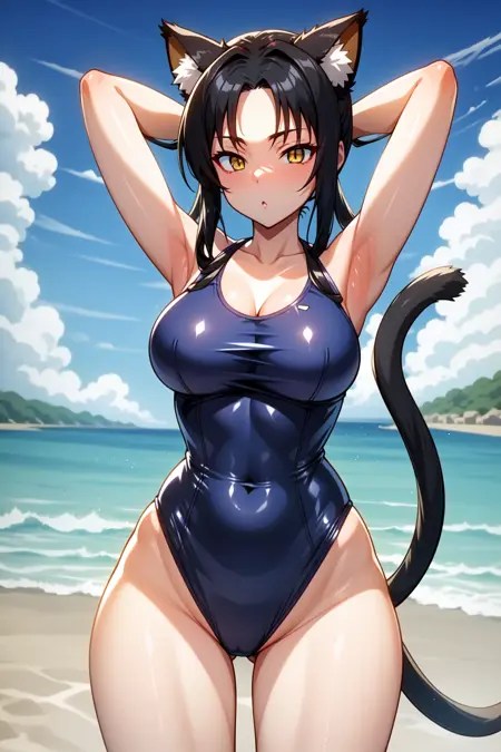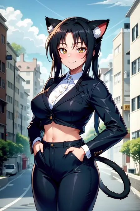 外見:クロカ、黄色い目、縦に細長い瞳孔、黒髪、長い髪、分け目のある前髪、髪の輪、猫の耳、動物の耳のふわふわ、猫の尾、複数の尾
