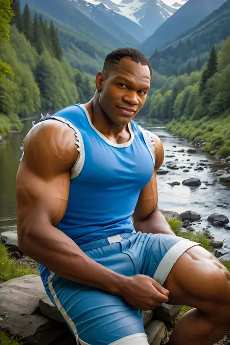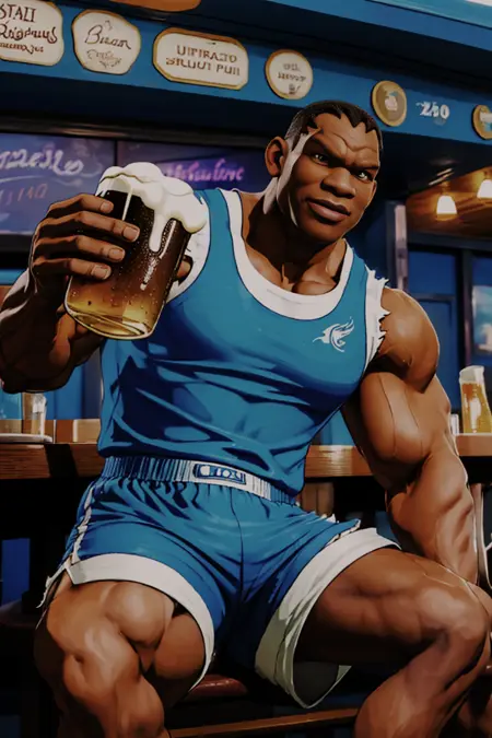 关键词:(拳击手套),(蓝色无袖上衣),(蓝色短裤),(靴子),(赤膊)。他的发型取决于你使用的模型。我无法加入缺失的牙齿。如需移除他的拳击手套,请在负面提示中使用 (boxing gloves)。