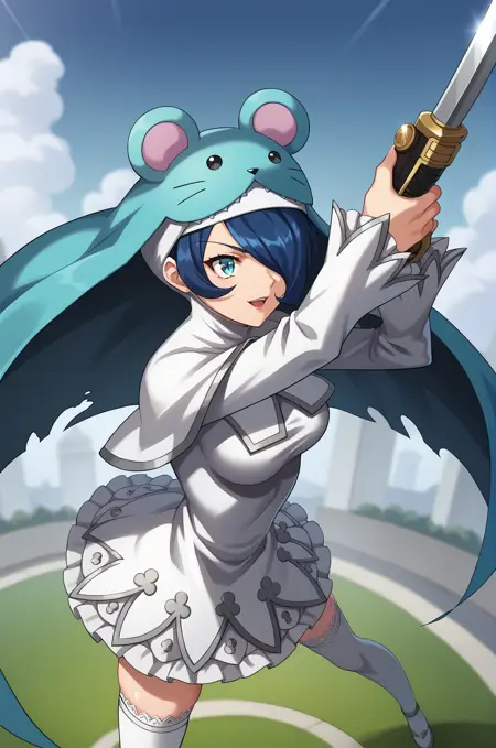 短发,蓝眼,长袖,连衣裙,武器,连裤袜,剑,手持武器,白色连衣裙,高跟鞋,手持剑,灰色连衣裙,灰色鞋履,动物帽子,动物耳朵,数码宝贝 \(生物\),动物兜帽