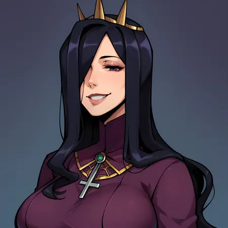 デフォルトの外見:QueenNancy、長い髪、片方の目に髪をかけている、黒髪、冠、紫のドレス、
