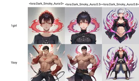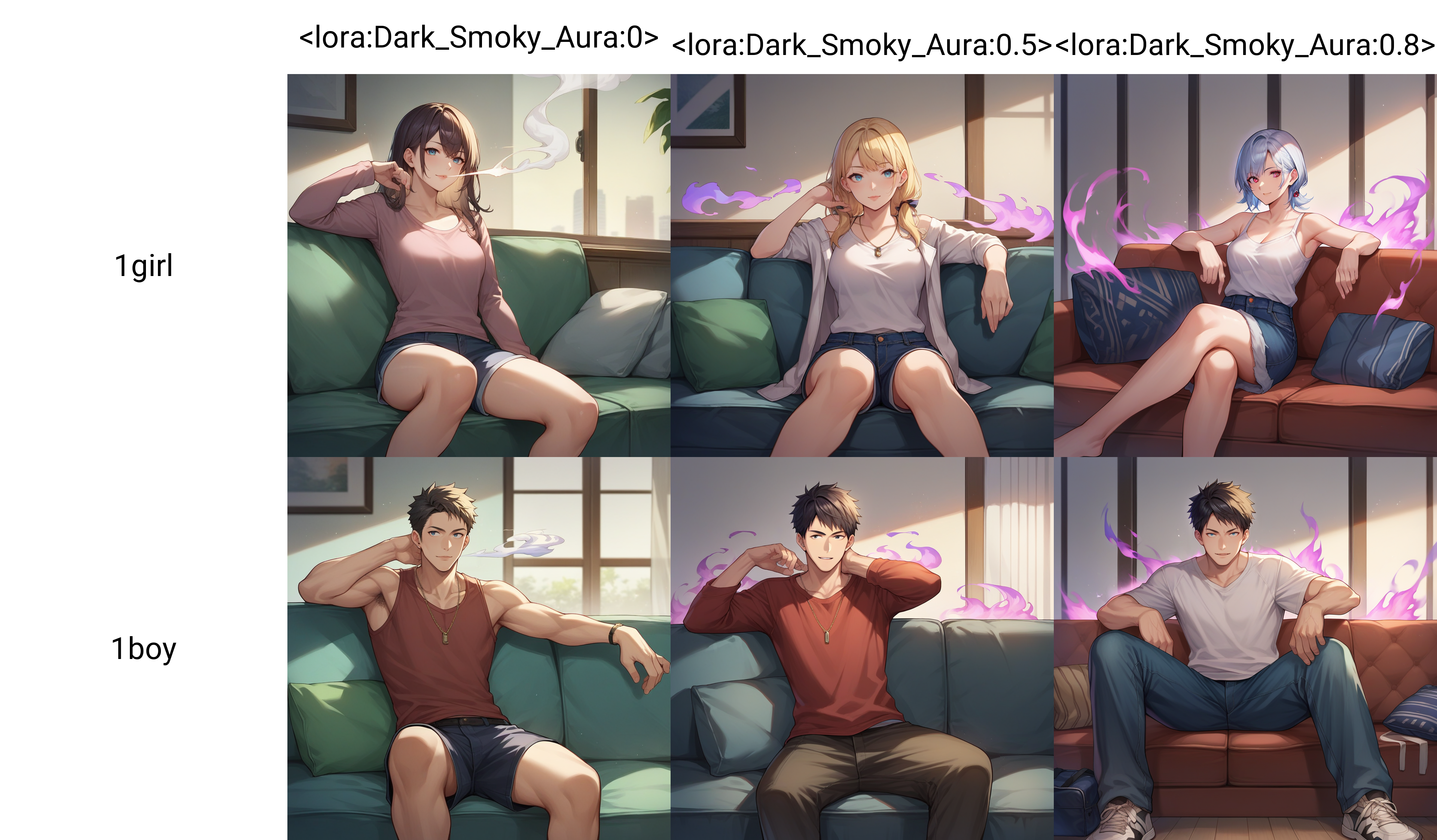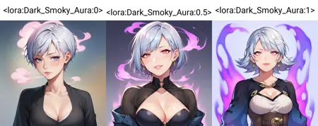 キャラクターに付着する煙のほのかな筋/オーラを生成するコンセプトLoRA。指定しない場合、紫色になる傾向があります。