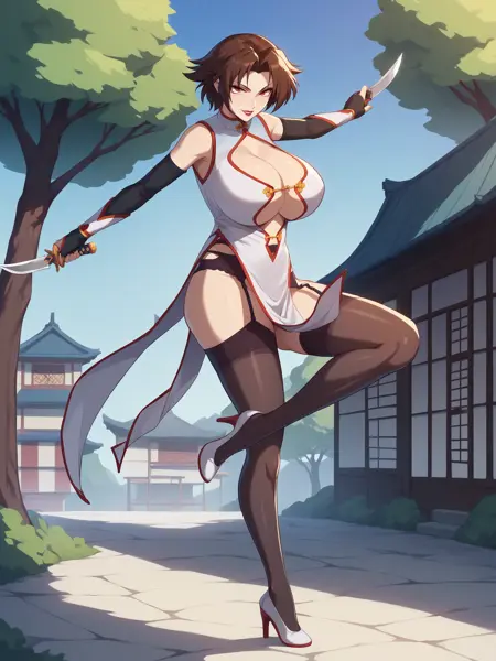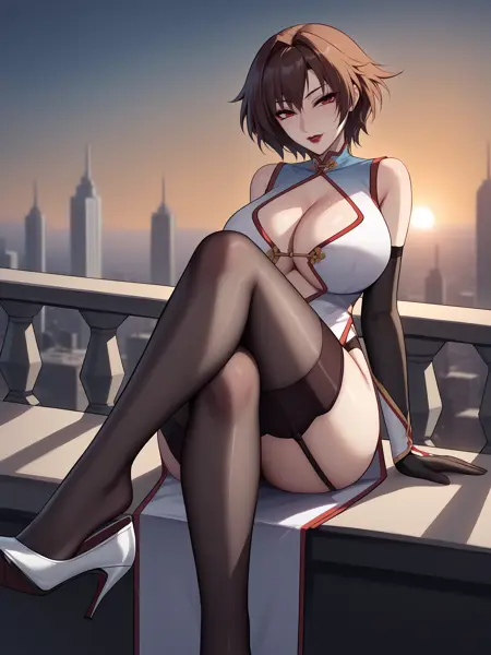 For her default dress: chinese dress, dress, chinese clothes ,gloves, underboob, cleavage