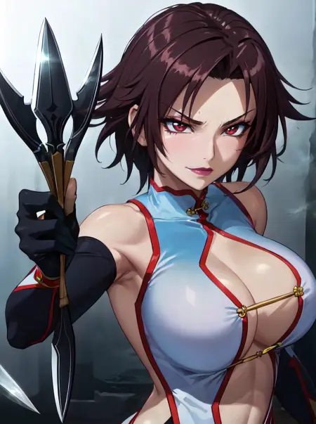 Lee Mayfeng, mature female, 1girl, nail fingers, makeup, large breasts, lipstick, red eyes, short hair, brown hair, underboob, cleavage