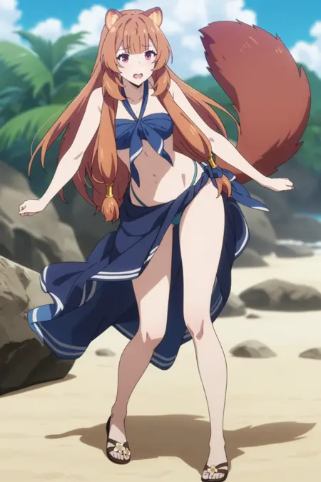 tny-raphtalia, raccoon tail, dress, skirt, breastplate, gloves, thigh boots, blue bikini, sarong, kimono