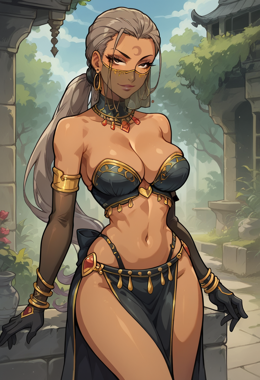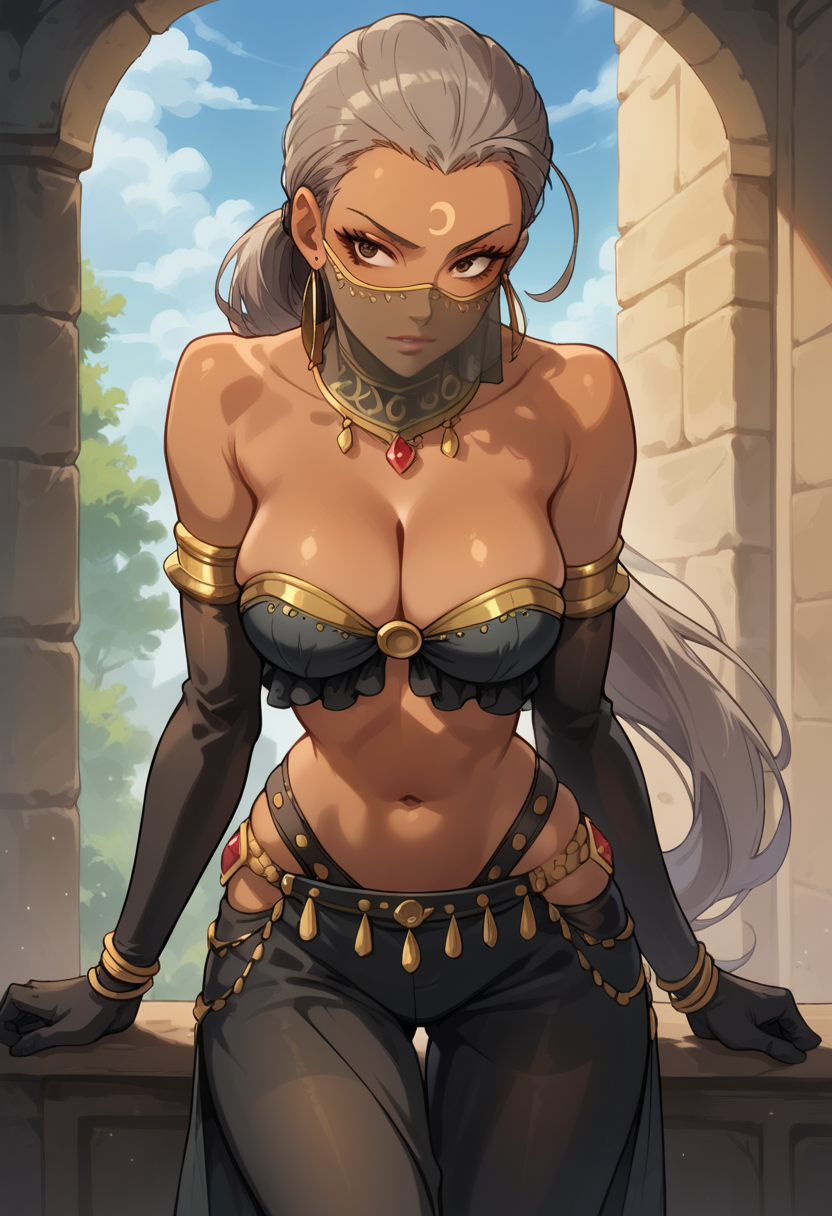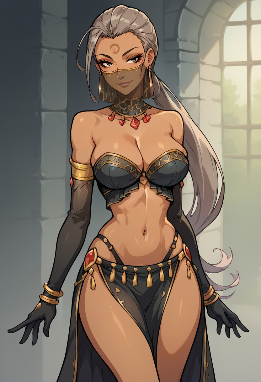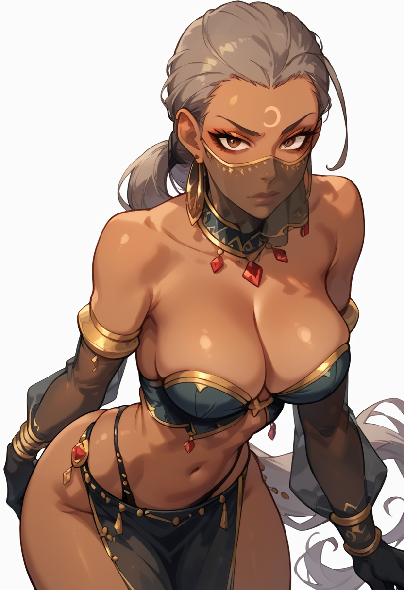 舞动的弯刀,埃德斯特罗姆,来自《Overlord》。触发词“埃德斯特罗姆”。棕色眼睛,细长眼睛,锐利眼睛,深色皮肤,深色皮肤女性,长发,首饰,面纱,手套,耳环,低马尾,妆容,灰发,肘部手套。这些特征应有所帮助。权重0.4-0.8